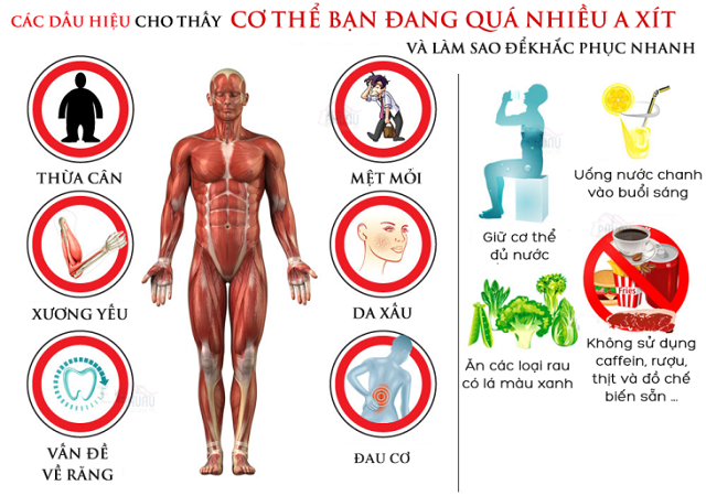 Việc tiêu thụ nhiều thực phẩm tính axit như thịt đỏ, nước ngọt, bia, rượu, đồ chiên rán, thức ăn nhanh… lượng axit trong người sẽ tăng lên. Lúc đó, cơ thể sẽ bị dư thừa axit, khiến tính kiềm cơ thể mất đi, sức đề kháng giảm xuống. Môi trường axít là điều kiện lý tưởng cho các gốc tự do phát triển trong cơ thể tích tụ lâu ngày sẽ gây nên nhiều bệnh như stress, đau dạ dày, viêm đại tràng, axit trào ngược dạ dày, gout và thậm chí là ung thư.